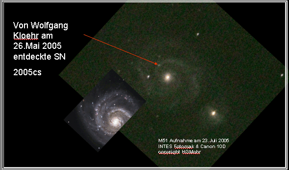 SN 2005cs in M51 Whirlpool Galaxy Date 2005 07 23Camera Canon D10 / Optic Intes M69 F6 FotomakImage HGMohr